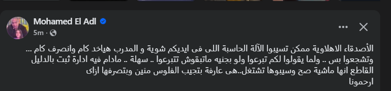 تحيا مصر، وكتب محمد العدل عبر حسابه الرسمي"فيس بوك": الأصدقاء الاهلاوية ممكن تسيبوا الآلة الحاسبة اللى فى ايديكم شوية و المدرب هياخد كام وانصرف كام، وتشجعوا بس ولما يقولوا لكم تبرعوا ولو بجنيه ماتبقوش تتبرعوا سهلة مادام فيه إدارة ثبت بالدليل القاطع انها ماشية صح وسيبوها تشتغل، هى عارفة بتجيب الفلوس منين وبتصرفها ازاى".