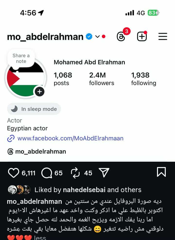 وكتب محمد عبد الرحمن في منشور رصده موقع تحيا مصر على حسابه الرسمي بموقع تبادل الصور والفيديوهات انستجرام، مرفقة صورة علم فلسطين: دي صورة البروفايل عندي من سنتين من يوم 10 أكتوبر بالظبط على ما أذكر، كنت واخد عهد ما أغيرهاش إلا إما ربنا يفك الأزمة ويزيح الغمة.