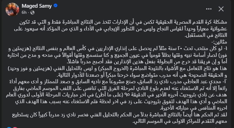 تحيا مصر، وكتب ماجد سامي عبر حسابه الرسمي"فيس بوك": مشكلة كرة القدم المصرية الحقيقية تكمن في أن الإدارات تتخذ من النتائج المباشرة فقط، و التي قد تكون عشوائية معياراً وحيداً لقياس النجاح وليس من التطور الإيجابي في الأداء و الذي من المؤكد أنه سيعود على النتائج في المستقبل".