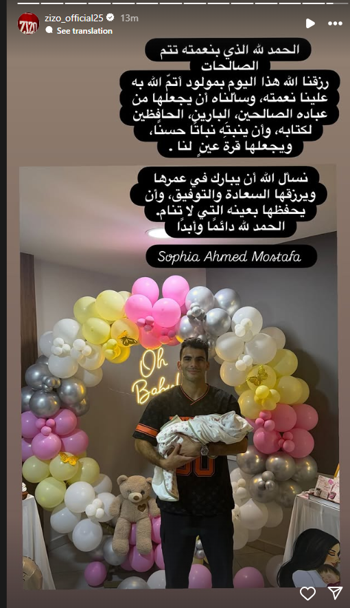 "نسأل الله أن يبارك في عمرها".. زيزو نجم الأهلي يرزق بمولودته التانية "صوفيا"