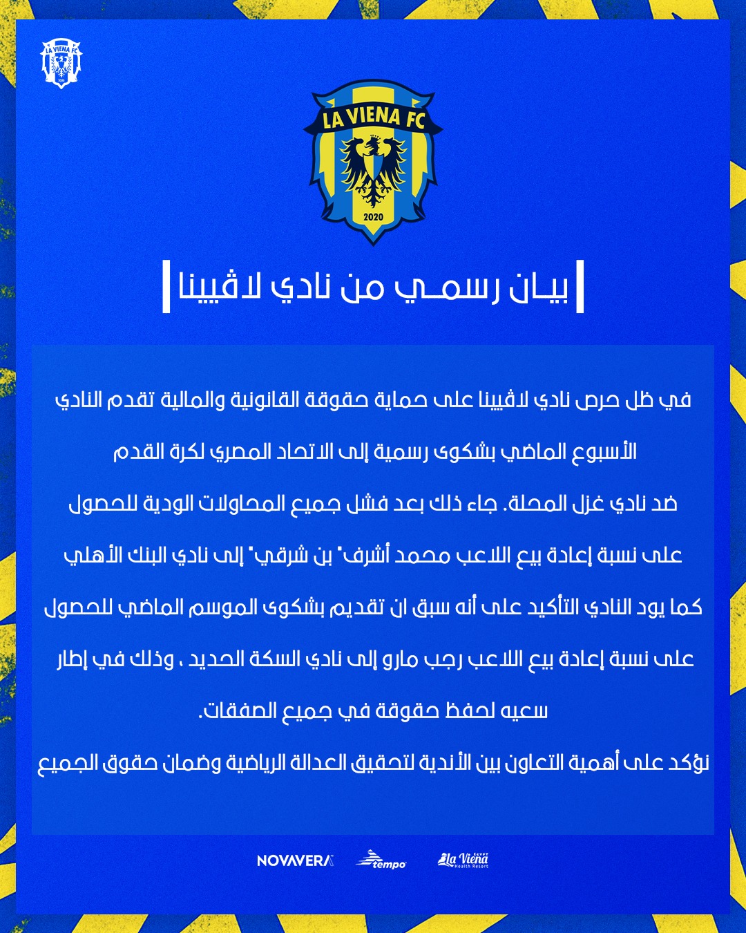 وكشف البيان الرسمي الذي أصدره مسؤولو مجلس إدارة نادي لافيينا إف سي مساء اليوم الأربعاء عن قيام إدارة النادي بتقديم شكوي رسمية إلي مسؤلي مجلس إدارة إتحاد كرة القدم ضد مسؤلي نادي غزل المحلة للحصول علي حقوق النادي في رعاية اللاعب محمد أشرف بني شرقي الذي تم إنتقاله لفريق البنك الأهلي في بداية الموسم الحالي من واقع اللوائح القانونية والبنود الموجودة في عقود اللاعبين بمنح الأندية حق رعاية لاعبيها خلال فترة الناشئين والشباب عند الإنضمام لأندية أخري كما هو سائد في جميع دول العالم المتقدمة كرويا.