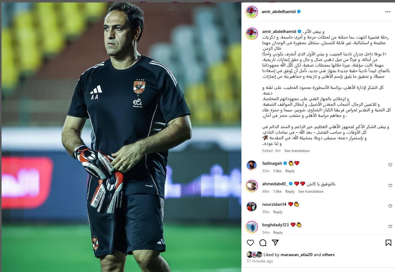 وجه أمير عبد الحميد مدرب حراسة المرمي بالنادي الأهلي، رسالة وداع لجماهير القلعة الحمراء بعد رحيله.