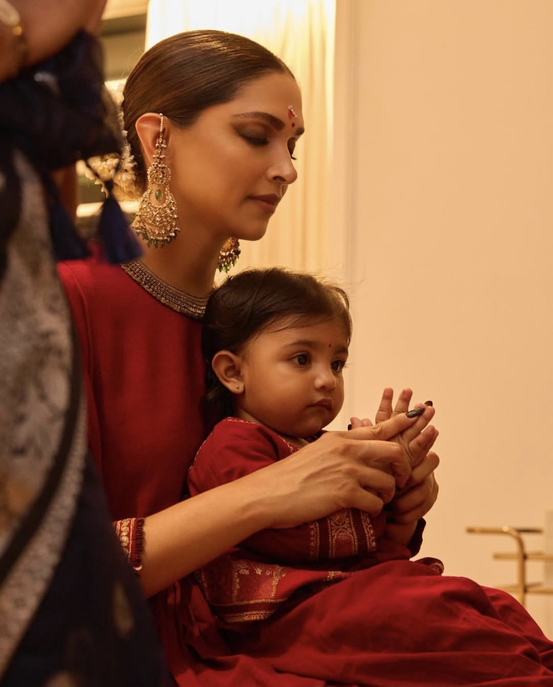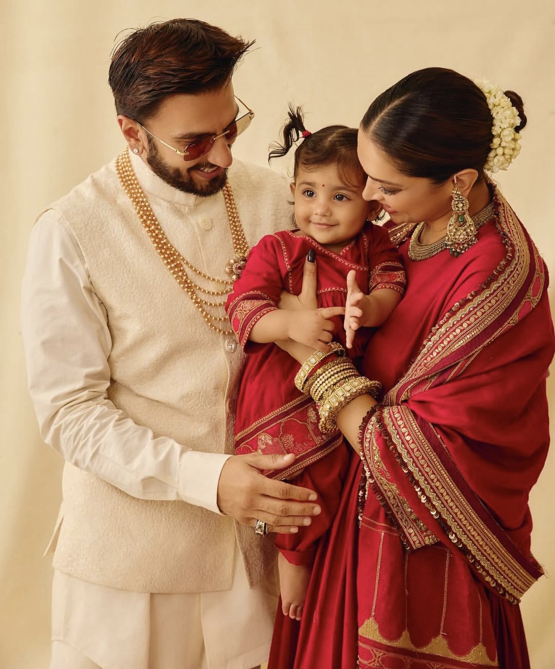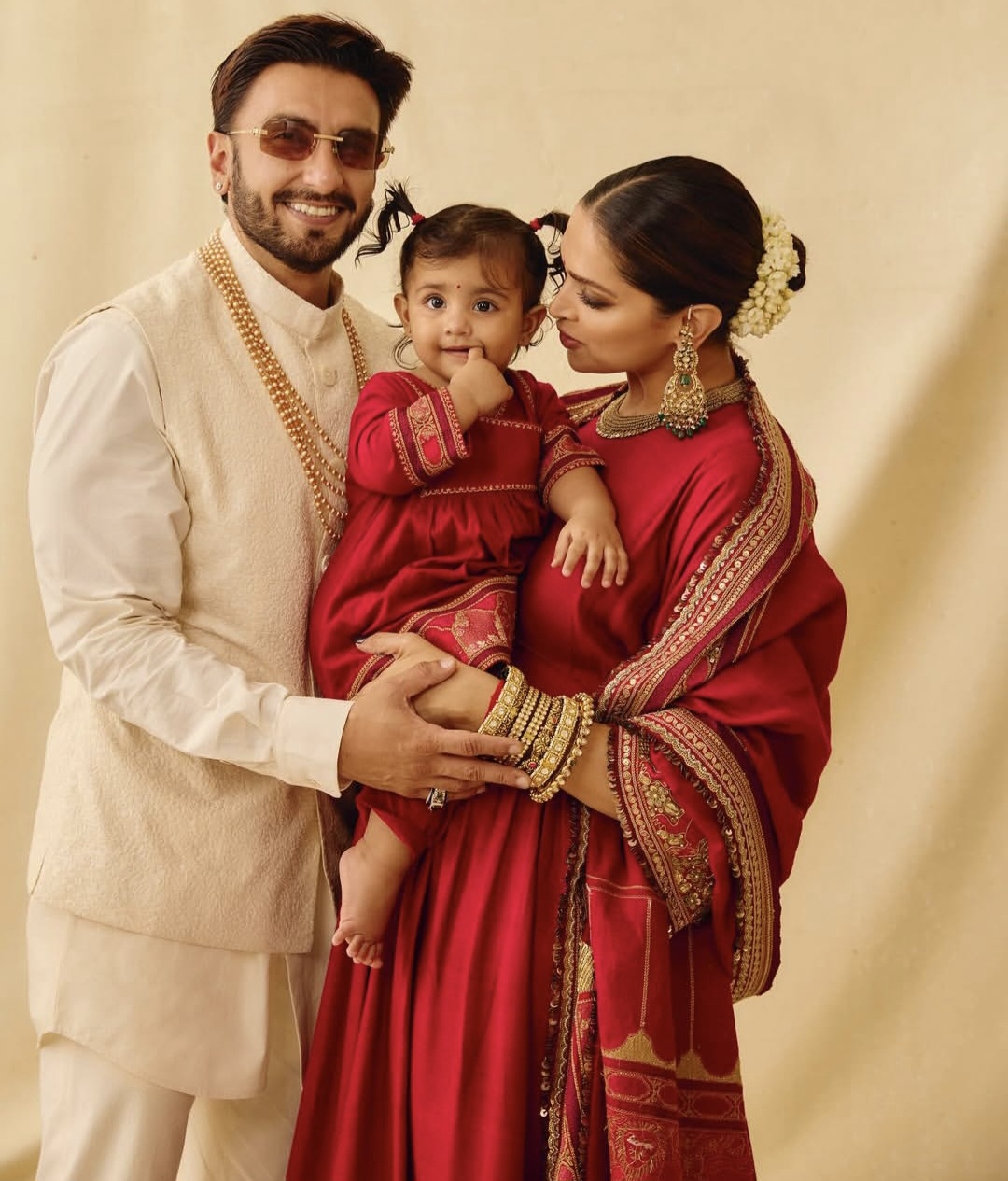 ديبيكا تألقت بساري أحمر مطرز بخيوط ذهبية ومجوهرات تراثية فخمة، بينما اختار رانفير زيًّا هندياً باللون العاجي مع إكسسوارات بسيطة، أما الصغيرة “دعاء”، فبدت نسخة مصغّرة من والديها، مرتدية فستانًا أحمر مطابقًا لإطلالة والدتها، لتكتمل الصورة العائلية بمزيج من الأناقة والدفء.