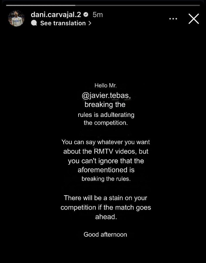 ونشر كارفاخال رسالة عبر حسابه الرسمي على إنستجرام قال فيها:"مرحبًا سيد خافيير تيباس، خرق القواعد هو إفسادٌ للمنافسة. يمكنك أن تقول ما تشاء عن مقاطع قناة ريال مدريد التلفزيونية، لكن لا يمكنك تجاهل أنّ ما ذُكر يُخالف القوانين. ستكون هناك وصمة على بطولتك إذا أُقيمت المباراة. نهارك سعيد."