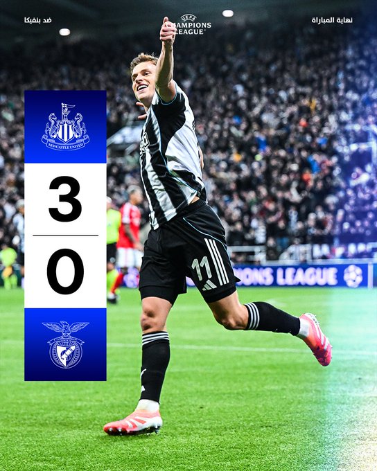 انتهت مباراة نيوكاسل يونايتد وبنفيكا في دوري أبطال أوروبا بفوز نيوكاسل الإنجليزي بثلاثية نظيفة، وتعرض بنفيكا البرتغالي للهزيمة الثالثة على التوالي.
