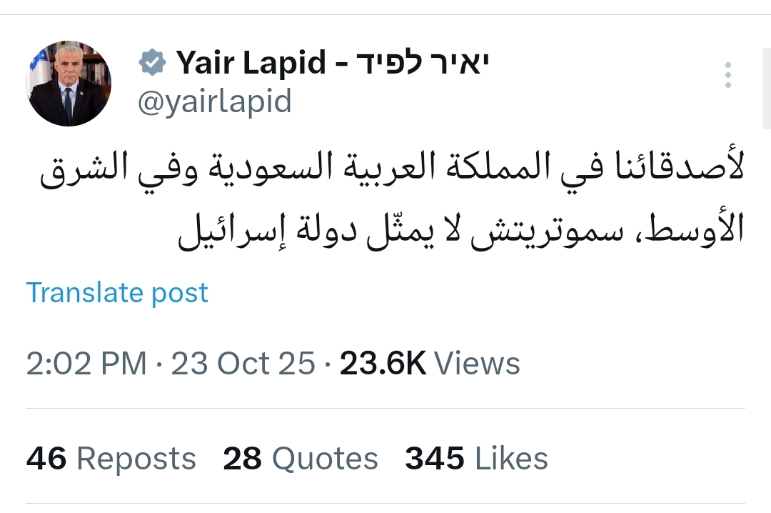 وفي تغريدة أخرى منفصلة باللغة العربية عبر منصة إكس وجه رسالة قائلاً: "لأصدقائنا في المملكة العربية السعودية وفي الشرق الأوسط، سموتريتش لا يمثّل دولة إسرائيل".