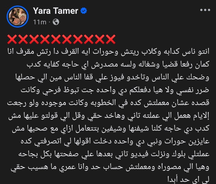 ونشرت يارا تامر منشورًا عبر حسابها الرسمي على فيسبوك نفت فيه كل ما تم تداوله عن إحالتها للمحاكمة وأكدت أنها محاولات لتشويه صورتها وتحقيق مشاهدات ليس إلا، وقالت يارا في منشورها الذي رصده موقع تحيا مصر: “إنتو ناس كدابة وكلاب ريتش وحورات، إيه القرف دا؟ أنا كمان رفعت قضايا وشغالة ولسه ما صدرش أي حاجة كفاية كدب وضحك على الناس، مين اللي حصل لها ضرر نفسي ولا هي دفعلكم؟ دي واحدة جت تبوظ فرحي وكانت قصدها عشان ما عملتش كده في الخطوبة وكانت موجودة.”