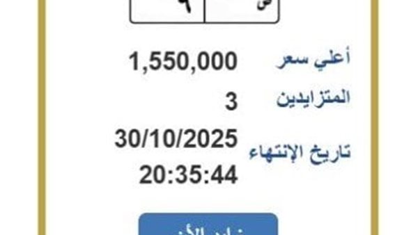 أعلنت بوابة مرور مصر الإلكترونية عن طرح لوحة سيارة نادرة للمزاد، حيث تجاوز سعرها الحالي مليون و550 ألف جنيه، ويحمل الرقم «ص 9». وتشارك في المزايدة حتى الآن ثلاثة أشخاص، وسط توقعات بأن يرتفع السعر خلال ساعات المزايدة الأخيرة، التي من المقرر أن تنتهي اليوم الخميس 30 أكتوبر 2025.