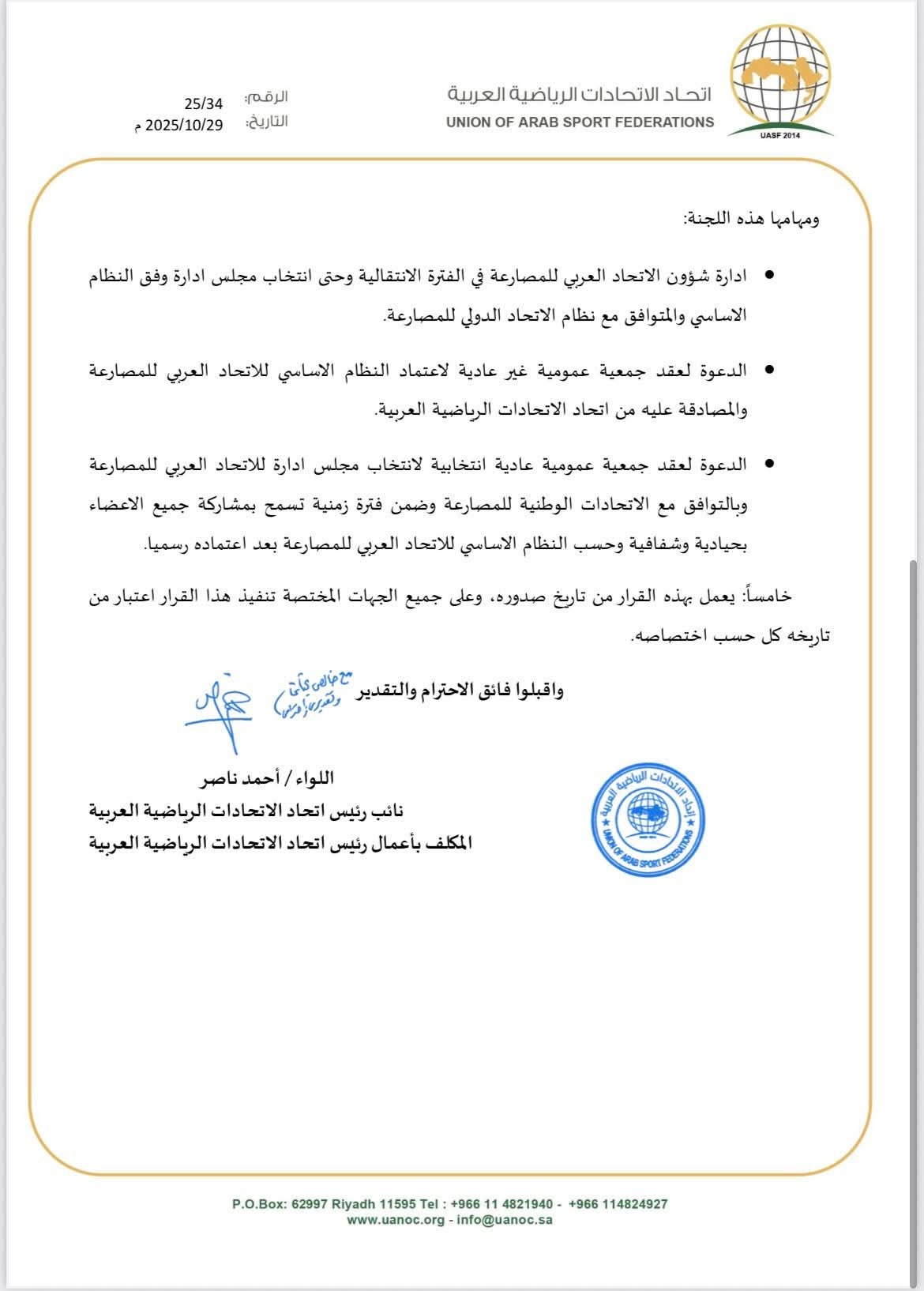 أولًا: عدم الموافقة على عقد الجمعية العمومية للاتحاد العربي للمصارعة بتاريخ 6 ديسمبر 2025، وتم التعميم بذلك من قبل الأمين العام للاتحاد العربي للمصارعة.
