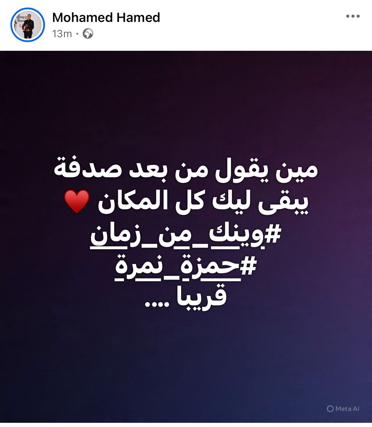وكشف المنتج محمد حامد، مقطع من أغنية وينك من زمان لـ حمزة نمرة، عبر حسابه الشخصي بموقع التواصل الاجتماعي فيس بوك، في منشور رصده موقع تحيا مصر، كتب: مين يقول من صدفة يبقى ليك كل المكان، وينك من زمان.