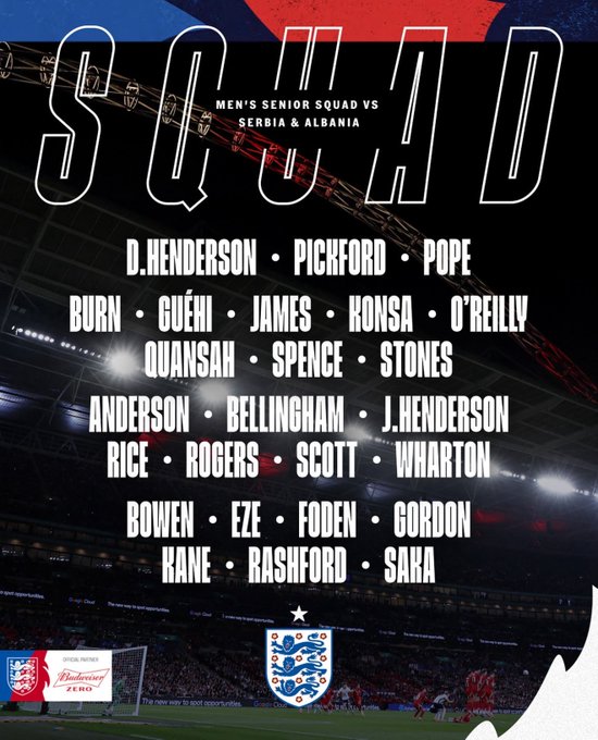 قائمة منتخب إنجلترا الرسمية لمواجهتي صربيا وألبانيا في تصفيات كأس العالم