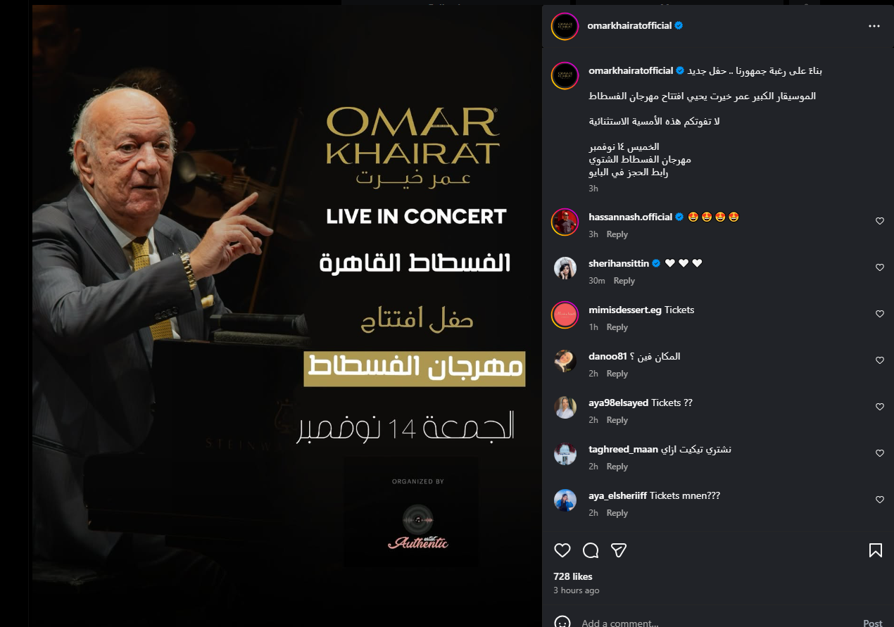 ومن المقرر أن يقدم الموسيقار عمر خيرت، باقة من أمتع مقطوعاته الموسيقاية الشهيرة، والتي يحبها الجمهور ويتفاعل معها، ومنها: ضمير أبلة حكمت، والخواجة عبد القادر، وفيها حاجة حلوة، وليلة القبض على فاطمة، وعارفة، وغيرها من الأعمال التي تُعد علامات في تاريخ الموسيقى المعاصرة، وفقا لما رصده موقع تحيا مصر، حيث شاركت الصفحة الرسمية للموسقار عمر خيرت، البوستر الرسمي للحفل، عبر صفحتها الرسمية على موقع التواصل الاجتماعي إنستجرام وعلقت عليه: بناءً على رغبة جمهورنا، حفل جديد، الموسيقار الكبير عمر خيرت يحيي افتتاح مهرجان الفسطاط، لا تفوتكم هذه الأمسية الاستثنائية، الجمعة ١٤ نوفمبر.