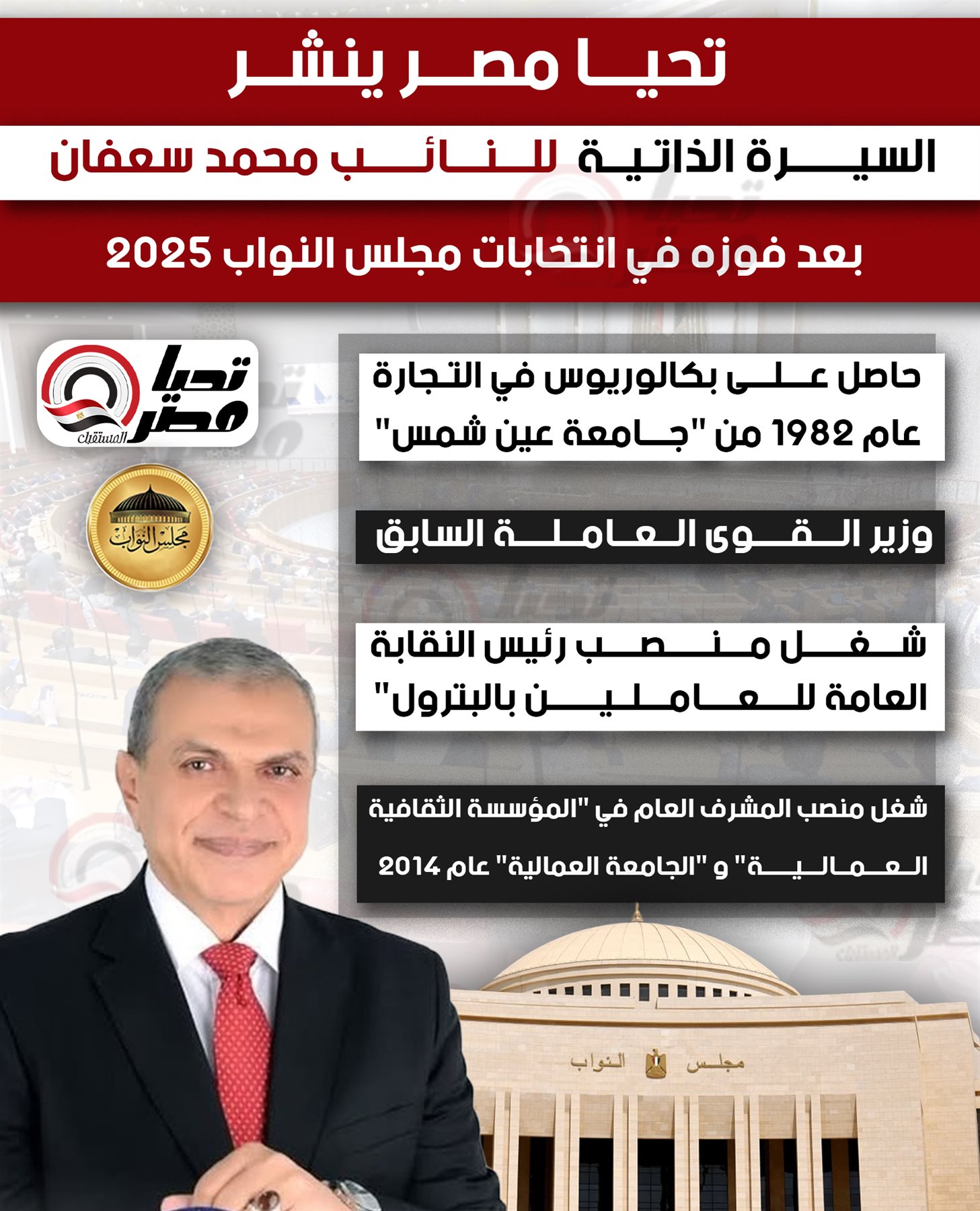 وينشر تحيا مصر السيرة الذاتية، للنائب محمد سعفان، والتي جاءت كالتالي: