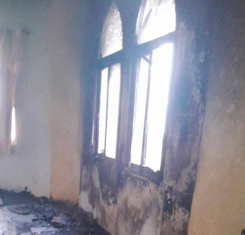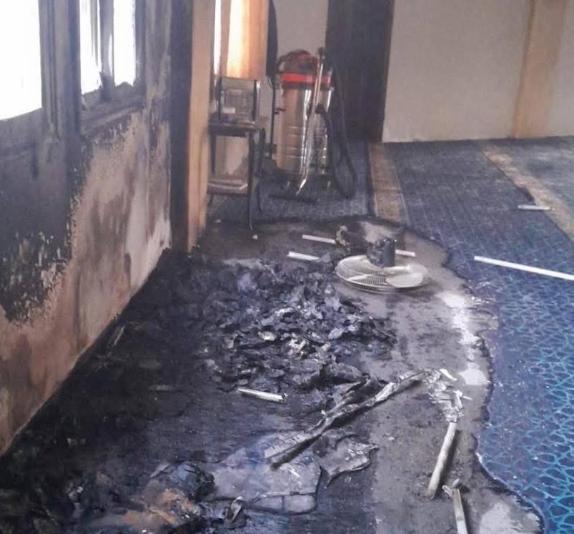 واضح أن:" المستوطنين سكبوا مواد قابلة للاشتعال عند المدخل، إلا أن تدخل الأهالي حال دون انتشار النيران على المسجد بالكامل".