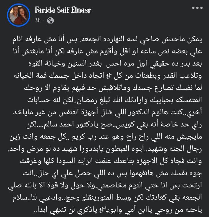 واختتمت فريدة رسالتها بالدعاء لشقيقها: كل جمعة وأنت زين رجال الجنة وشهيد، المبطون يا بدر شهيد ده لو مرض واحد، وأنت فجأة كل الأجهزة بتاعتك علقت الراية السودة كلها وغرقت جوه نفسك، مش هتفهموا بس ده اللي حصل، على أي حال، أنت ارتحت بس أنا حتى النوم مخاصمني، ولا حول ولا قوة إلا بالله.