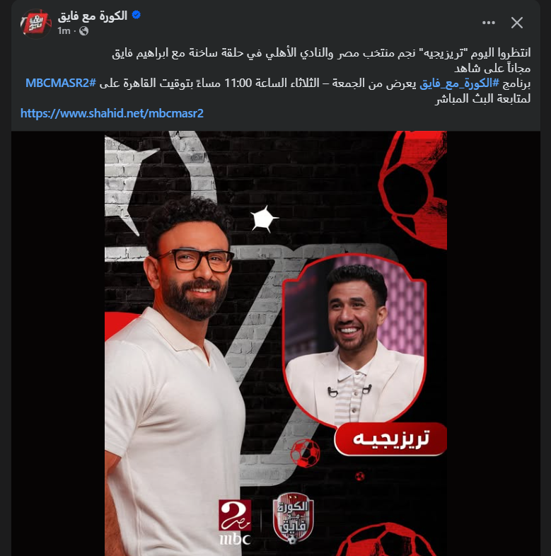 تحيا مصر، ومن المقرر أن يظهر تريزيجيه ، في تمام الساعة الحادية عشر مساءً فى برنامج الكورة مع فايق.