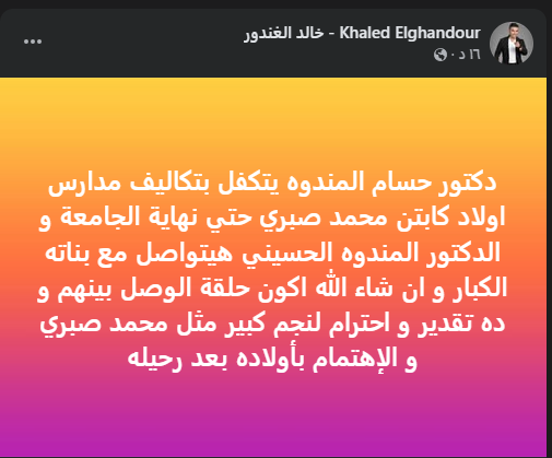 وكتب خالد الغندور على فيسبوك، إن الدكتور المندوه الحسيني سيتولى كذلك التواصل مع بنات الراحل الكبار لتقديم الدعم اللازم لهن، مشيرًا إلى أنه سيلعب دور حلقة الوصل بين الطرفين لضمان وصول المساعدة بالشكل الأمثل.