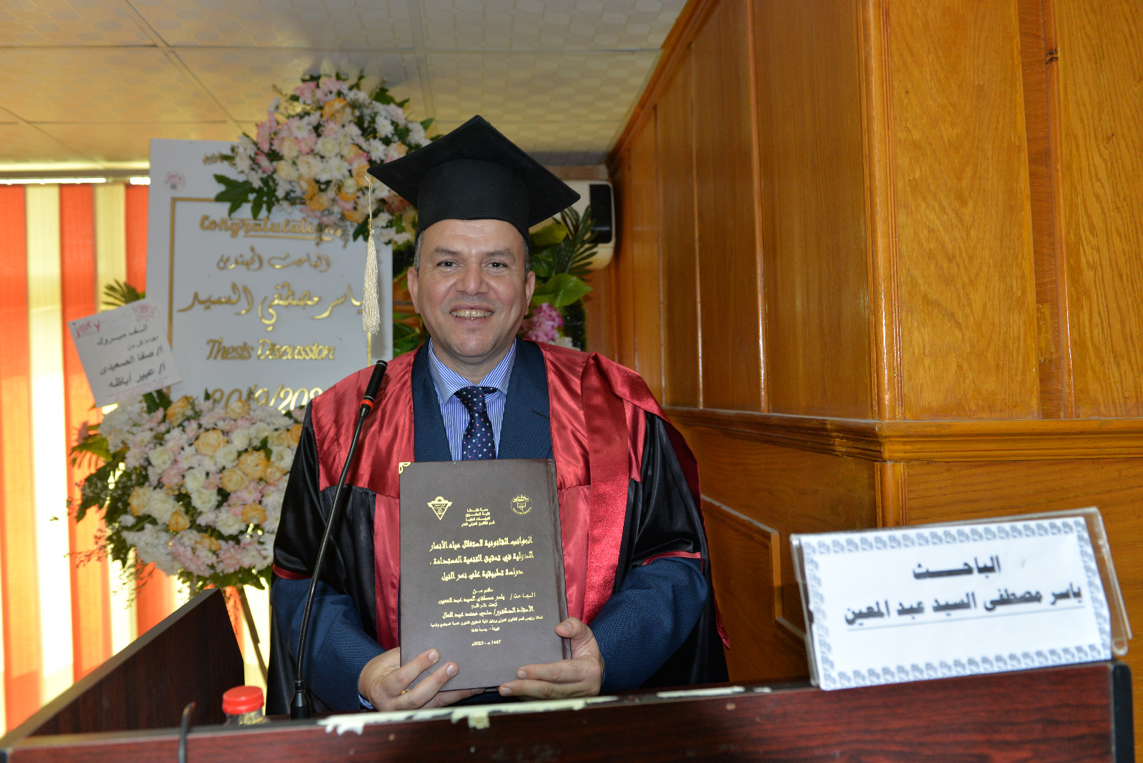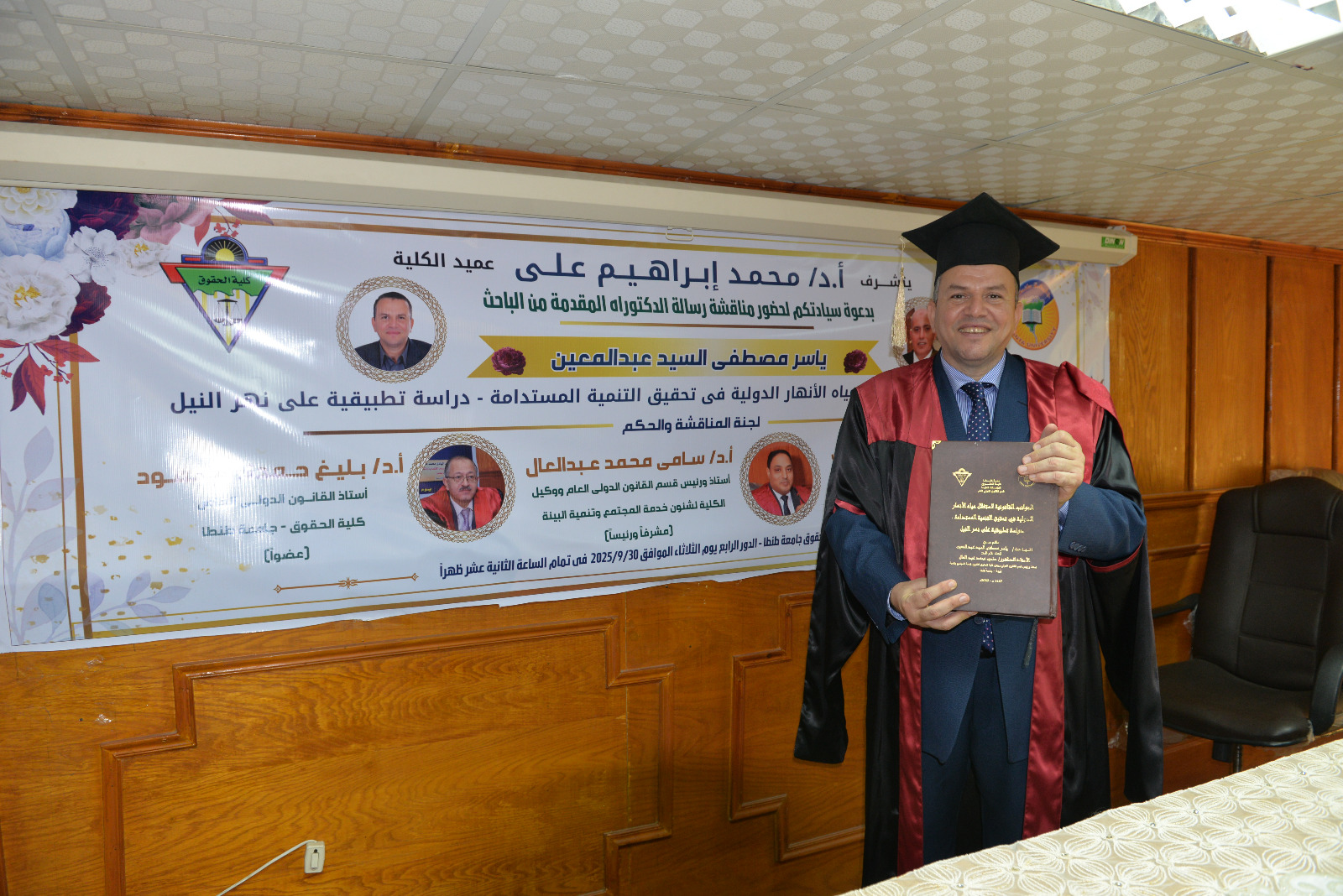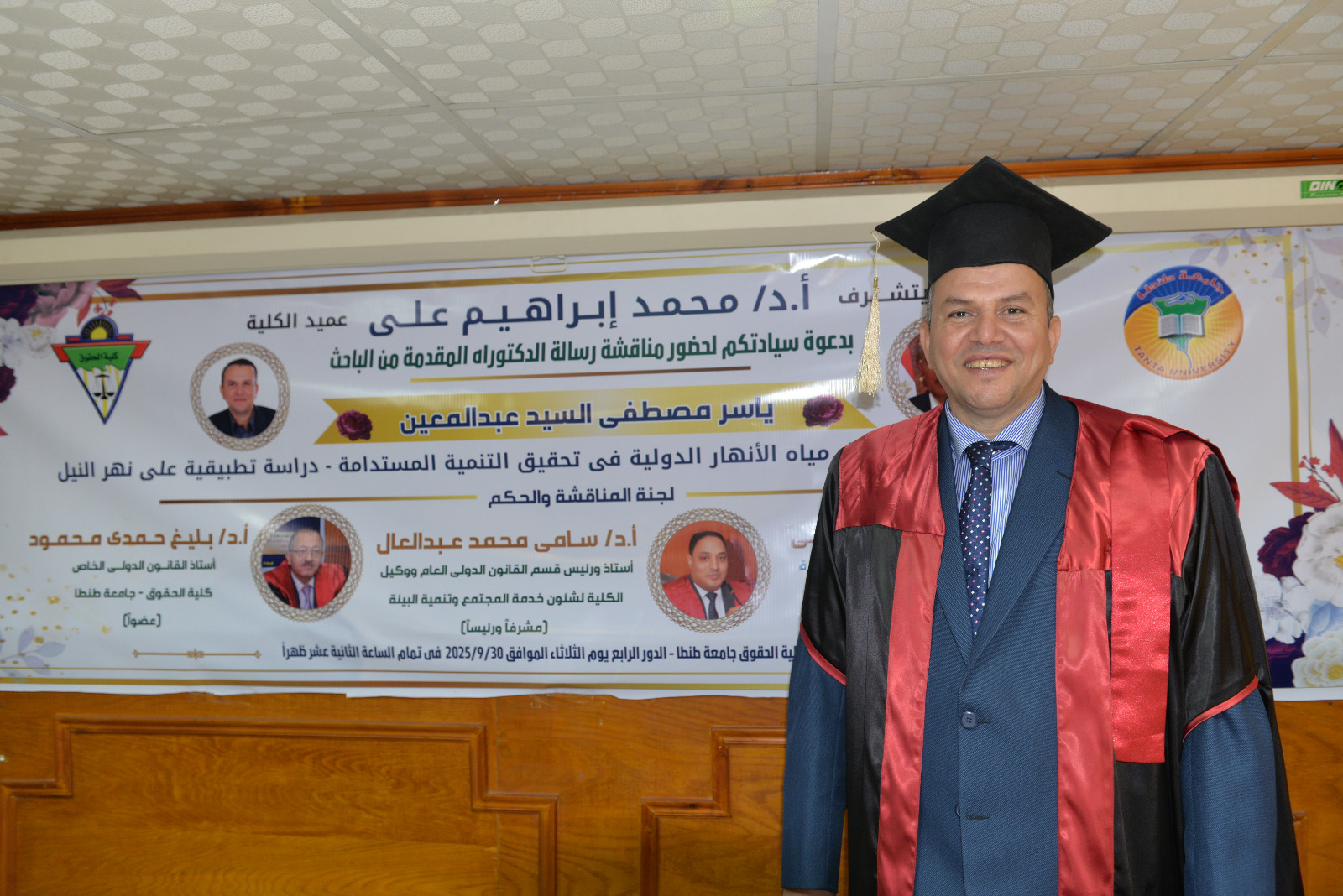 حصل الباحث ياسر مصطفى على درجة الدكتوراة بتقدير امتياز مع مرتبة الشرف من كلية الحقوق جامعة طنطا . فى رسالة بعنوان " الجوانب القانونية لاستغلال مياه الأنهار الدولية دراسة تطبيقية على نهر النيل .