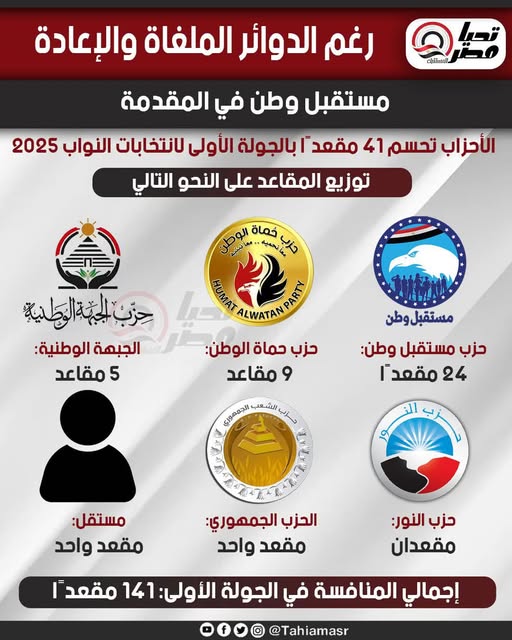 رغم الدوائر الملغاة والإعادة... "مستقبل وطن" في المقدمة.. الأحزاب تحسم 41 مقعدًا بالجولة الأولى لانتخابات النواب 2025