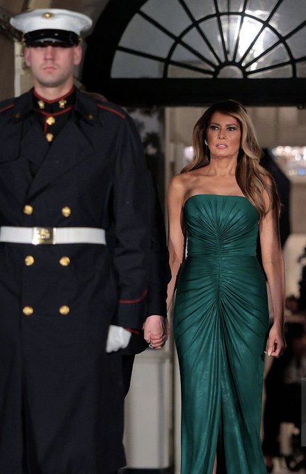 حظيت إطلالة السيدة الأولى ميلانيا ترامب، خلال استقبالها ولي العهد السعودي الأمير محمد بن سلمان، أثناء زيارته إلى البيت الأبيض لحضور حفل عشاء باهتمام واسع، لكن ما أثار اهتمام الكثيرين هو لون الفستان المستوحى من العلم السعودي.