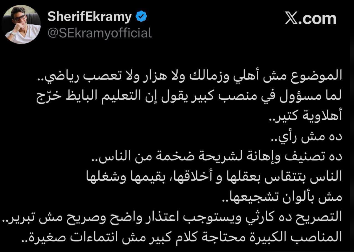 تحيا مصر، وكتب شريف إكرامي عبر حسابه الرسمي"أكس":" الموضوع مش أهلي وزمالك ولا هزار ولا تعصب رياضي، لما مسؤول في منصب كبير يقول إن التعليم البايظ خرّج أهلاوية كتير دش مش رأي".