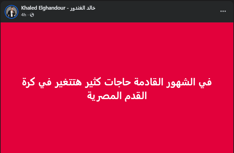 تحيا مصر، وكتب خالد الغندور عبر حسابه الرسمي"فيس بوك": فيه الشهور القادمة حاجات كتير هتتغير في كرة القدم المصرية".