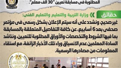 قام المركز الإعلامي لمجلس الوزراء بالتواصل مع وزارة التربية والتعليم والتعليم الفني والتي نفت تلك الأنباء مؤكدة أنه لا صحة لإعلان الحكومة عن تخصصات ومعايير اختيار المعلمين المطلوبة في مسابقة تعيين 30 ألف معلم