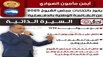 حسين خضير يفوز بانتخابات مجلس الشيوخ عن القائمة الوطنية بالدقهلية فاز حسين خضير في انتخابات مجلس الشيوخ 2025 عن القائمة الوطنية "من أجل مصر" بمحافظة الدقهلية، وذلك بعد حصول القائمة على نسبة تتجاوز 5% من أصوات الناخبين. تحيا مصر ينشر السيرة الذاتية للنائب حسين خضير عضو مجلس الشيوخ 2025 وينشر موقع تحيا