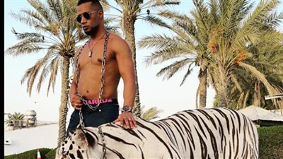 محمد رمضان يثير الجدل من جديد بظهوره الى جانب نمر ضخم ذو أنياب حادة بقصر سمو الشيخة فاطمة بنت راشد بمدينة دبي بدولة الامارات العربية.