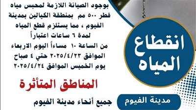 قررت شركة مياه الشرب والصرف الصحي فى بنى سويف، اليوم الأربعاء قطع المياه عن مركز ومدينة إهناسيا اعتباراً من الساعة 8 صباحاً حتى الساعة 9 مساءً، وذلك من أجل تطهير الخزان الأرضي والمُرشحات بمحطة مياه البديني.