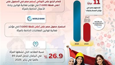 نشر المركز الإعلامي لمجلس الوزراء عددًا من الإنفوجرافات عبر منصاته على مواقع التواصل الاجتماعي، استعرض من خلالها إشادات المؤسسات الدولية، بما حققته مصر من إنجازات في تمكين وحماية المرأة.