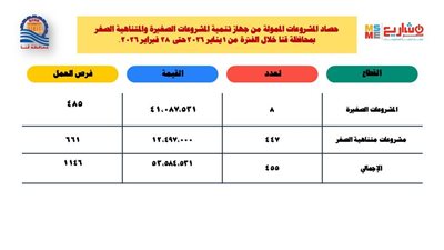 أكد المهندس محمود العماري، رئيس فرع جهاز تنمية المشروعات الصغيرة والمتوسطة بمحافظة قنا، ضخ تمويلات بلغت قيمتها 53 مليونًا و584 ألفًا و531 جنيهًا، استهدفت دعم المشروعات الصغيرة ومتناهية الصغر خلال شهري يناير وفبراير من العام الجاري 2026. المشروعات الصغيرة توفر مئات فرص العمل الجديدة وأوضح العماري،