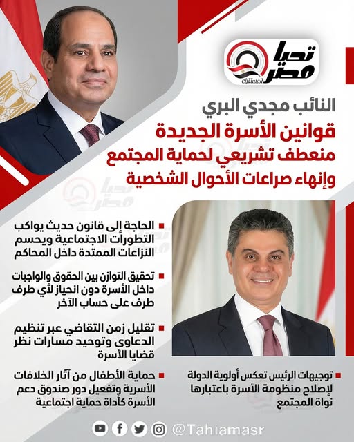 أكد النائب مجدي البري، عضو مجلس الشيوخ، أن توجيهات الرئيس عبد الفتاح السيسي للحكومة بسرعة إعداد وإحالة مشروعات قوانين الأسرة (المسلمة والمسيحية وصندوق دعم الأسرة) إلى البرلمان، تمثل "منعطفًا تاريخيًا" في مسار العدالة الاجتماعية، واصفًا إياها بأنها ثورة تشريعية اجتماعية تعيد التوازن بين صراعات الاسر المصرية نتيجة الخلافات وتكون ضحاياها من الاطفال و الاباء و الامهات و التي تعد تنظيم العلاقات الأسرية وفق رؤية الدولة للجمهورية الجديدة.